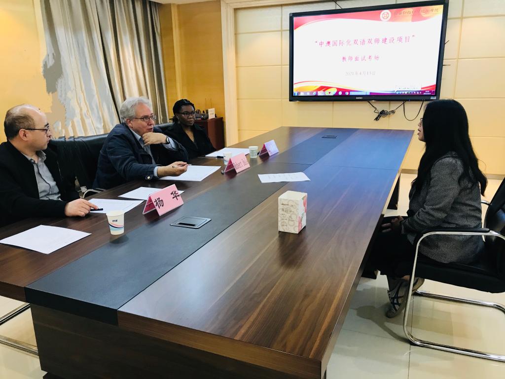 面试由两部分组成:自我介绍及问答。面试过程有条不紊,16名教师以良好的精神面貌,深厚的语言和专业功底,沉着应答,完成面试过程。通过此次遴选,我们将选拔若干名优秀教师参加项目培训,此次培训有利于教师教学能力水平的提升,同时,为学院双语教师储备做好铺垫。我院在2020年已申请成为中国教育国际交流协会“百千万”项目会员单位,学院将以此为契机,不断深化国际交流与合作,全面提升学院教师的双语教学能力,为中外合作办学机构建设、留学生教学做好充分准备。