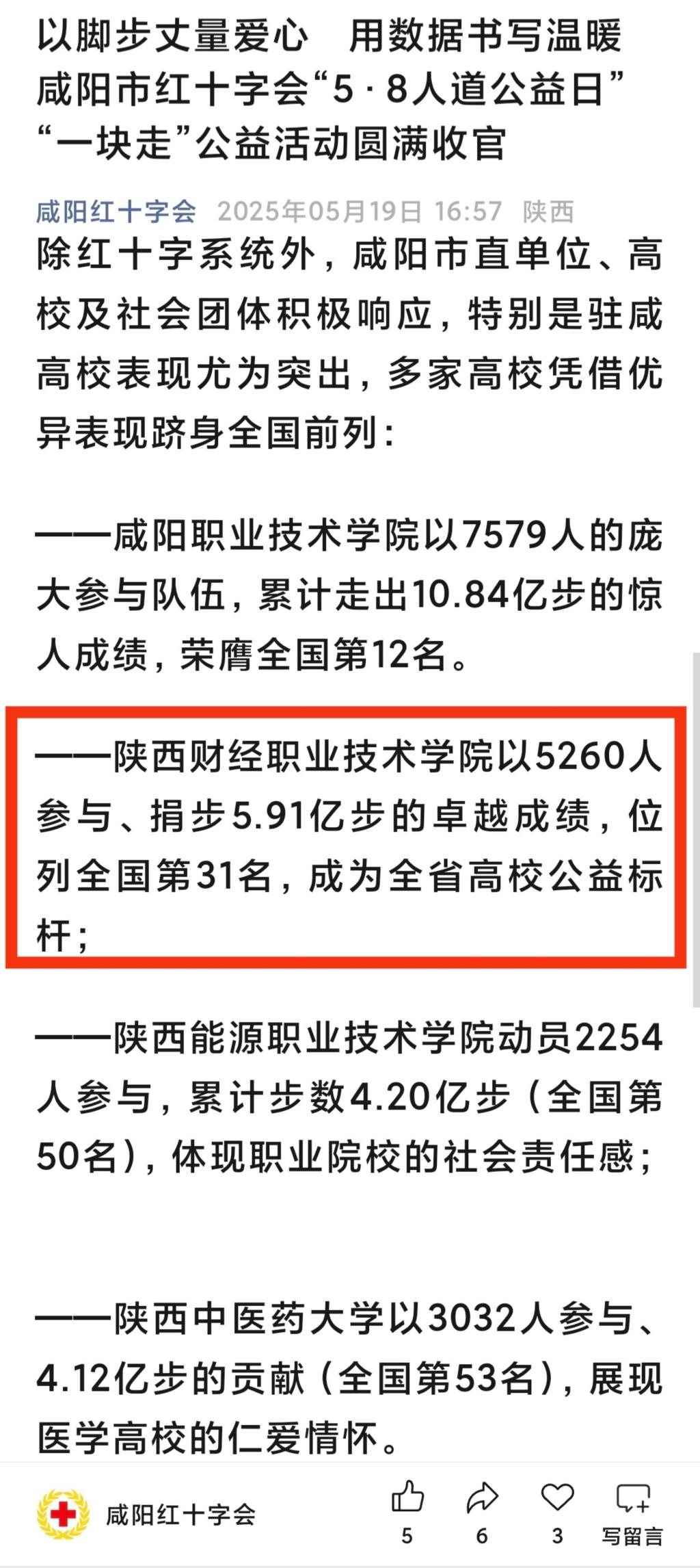 ——用脚步传递爱,“一块走”公益捐步活动。在第78个“世界红十字日”期间,我校团员青年积极响应中国红十字会号召,以高涨热情积极参与“一块走——5・8人道公益活动”公益捐步活动,每日坚持步行锻炼并将累计步数转化为公益基金,切实为困难人群送去温暖关怀。此次活动中,我校在全国6621支参与队伍中斩获第31名的优异成绩,生动营造出向上向善的校园公益氛围,让青春力量在人道公益实践中绽放光彩。