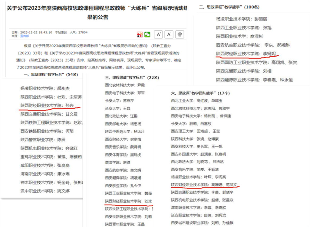 12月22日,中共陕西省委教育工委、陕西省教育厅公布了2023年度陕西高校思政课程课程思政教师“大练兵”省级现场展示活动获奖教师名单。我校思政课教师孙兴荣获思政课程“教学标兵”称号,经济法教师刘冰荣获课程思政“教学标兵”称号,思政课教师李嫣妮获思政课程“教学能手”称号,思政课教师高姗姗和学生范凤文获思政课“教学团队能手”称号,取得了我校历史最好成绩。