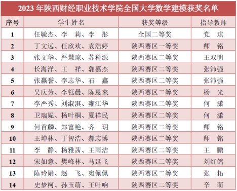 近三年来,学校高度重视数学建模竞赛的组织培训工作,累计获得美国大学生数学建模竞赛二等奖1项;全国大学生数学建模竞赛国家一等奖2项,国家二等奖2项,省级奖项34项;连续两年获得陕西赛区优秀组织奖。学校将进一步总结经验,改进不足,争取在数学建模竞赛中取得更多标志性成果。