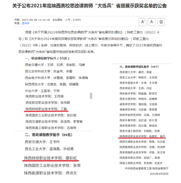 2021年度陕西高校思政课教师“大练兵”省级展示活动获奖教师及团队名单已公布,经学校推荐、网络初评、线上展示、专家评审等环节,我校教师丁静获“思政课程教学标兵”称号,夔彩虹获“思政课程教学能手”称号,翁建定团队获“思政课教学团队能手”称号。