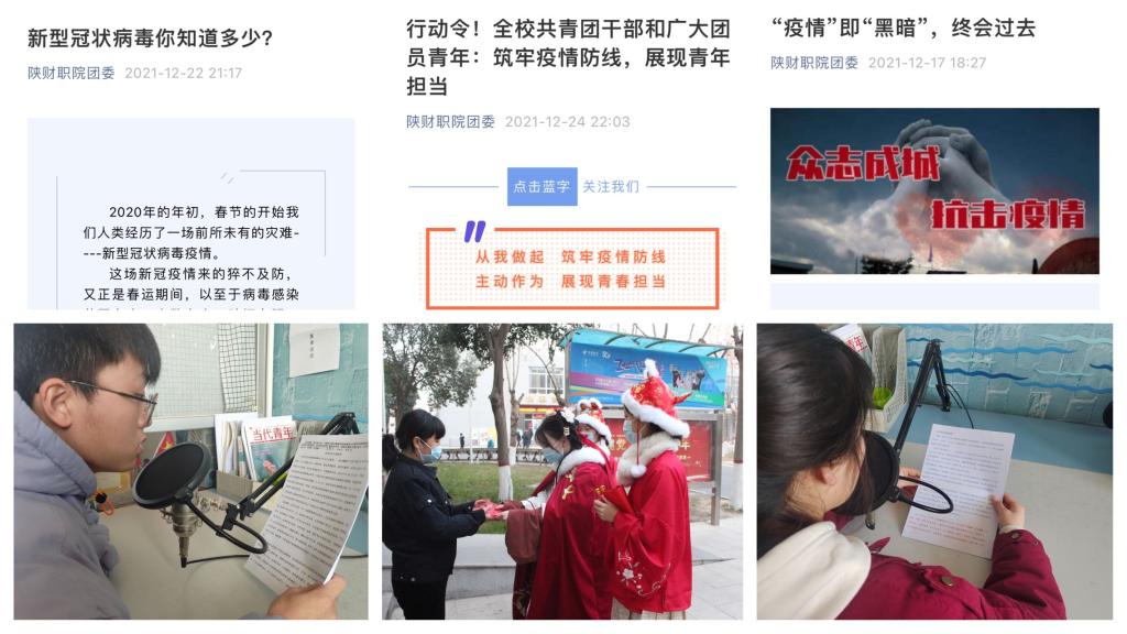 强化团的引领力,筑牢抗疫思想防线。校团委充分运用团属媒体做好舆论引导工作,第一时间向各二级学院团总支、团支部下发《行动令!全校共青团干部和广大团员青年:筑牢疫情防线,展现青年担当》,号召广大团学干部、团员青年迅速行动起来,在做好本职工作的同时,听指挥、勇拼搏、见行动,在校党委的统一指挥下,科学、有序参与校园疫情防控工作。截至1月17日,共发布了《疫情当前,青年请出列!》《同心同行,战疫同行》《抗疫战场上隐形的“大白”》《 疫情防控 陕财学子在行动》等“抗疫”内容相关推文35篇,制作发布《爸妈,我在陕财挺好的!》《隔空拥抱》等公原创视频24个,有力引导学生遵守各项防控规定,理性应对疫情,消除恐慌心理。校园之声广播站累计开展疫情防控知识宣传、封校生活互动等《疫情防控》专栏节目44次,剪纸社、书法社、麦秆画社、汉服社等学生社团结合自身特色助力疫情防控宣传10余次,各二级学院团总支依托公众号、QQ群等线上平台开展抗疫主题宣传活动百余次,坚持正面引导,筑牢学生抗疫思想防线。