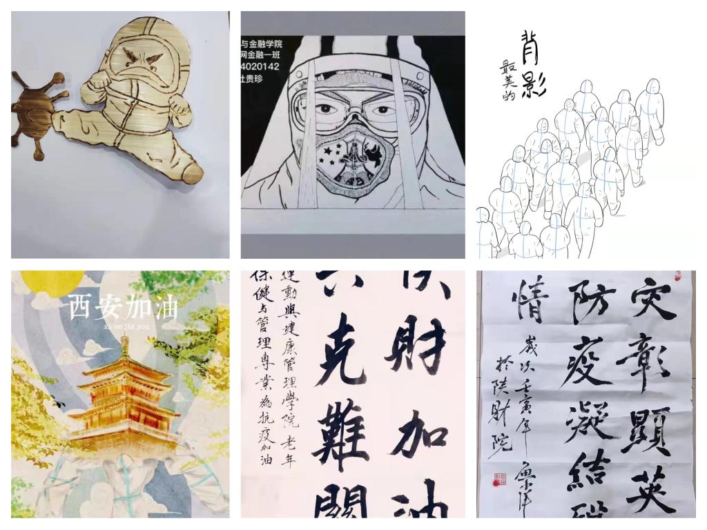 “艺满财院”书画大赛同学们充分发挥才艺,贡献了许多优秀精彩的作品,作品多以赞美与歌颂一线抗疫战士为主,其中不乏创意佳作。人文艺术学院雷玉杰同学用麦秆画制作的《病毒快走开》展示了非遗文化的魅力。大数据人工智能学院李佳乐同学的作品《最美的背影》用精美的笔触和丰富的创意展示了抗疫人员在此次疫情期间的无畏与果敢。经济与金融学院李芳苹绘制的《最美逆行者》更是将抗疫人员前赴后继,不惧生死的崇高精神描绘的淋漓尽致。