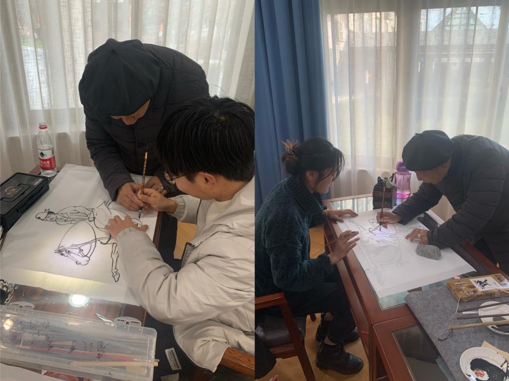 实训课上,董守信首先介绍了中国画的发展历史,随后以自己的作品为例,分享了将壁画、工笔画等不同技艺结合到作品中的经验和体悟,最后谈到传统艺术的发展应与时俱进,探索创新。实践环节,董守信依据唐壁画复制的步骤,手把手教授同学们拓稿、勾线、着色和做旧。学生们聚精会神、宁心静气的在笔尖和墨间临摹壁画、感受东方神韵。本次实践教学活动为期两天,不仅丰富了学生的艺术理论知识,还带领学生感受了中国绘画的笔精墨妙及华夏技艺的精巧细腻。