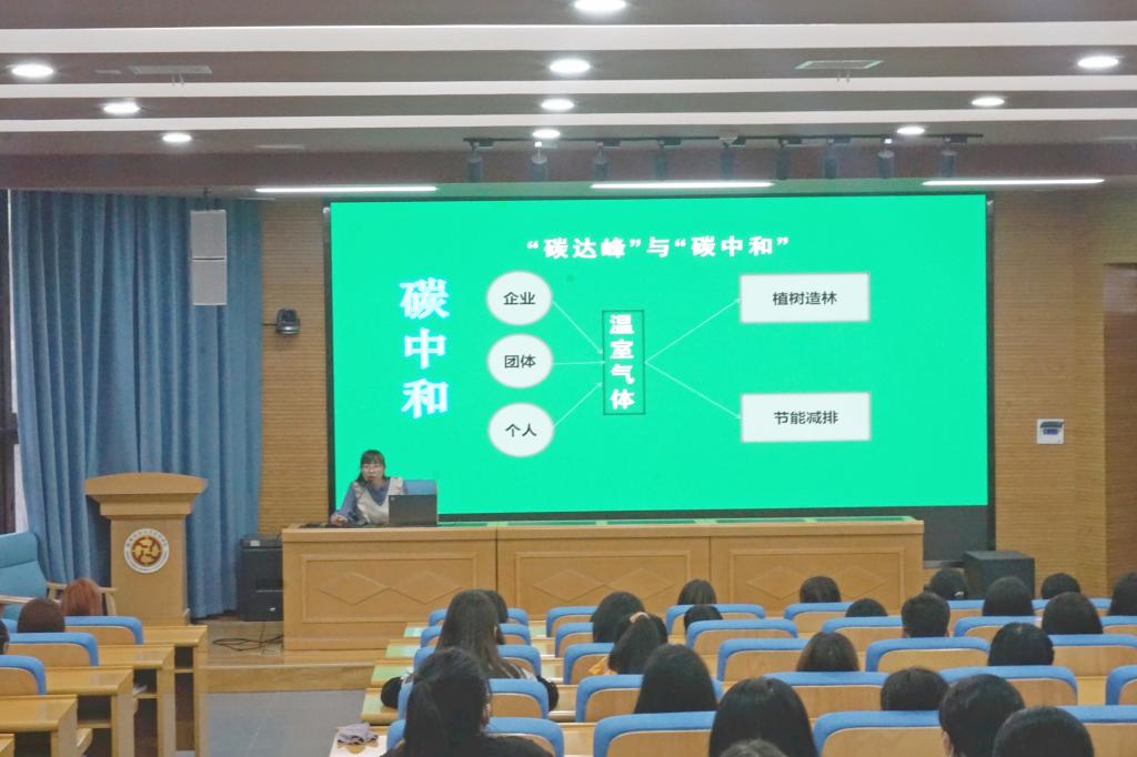 尚丽在讲座中重点介绍了碳达峰、碳中和、低碳粮食等生态文明基础知识,还从随手关灯、拔插头、不坐电梯爬楼梯,尽量少使用一次性牙刷、一次性塑料袋、一次性水杯、饭盒等方面倡导学生低碳生活,从我做起。讲座现场还进行了知识问答等互动环节,极大了激发了学生们的参与积极性。