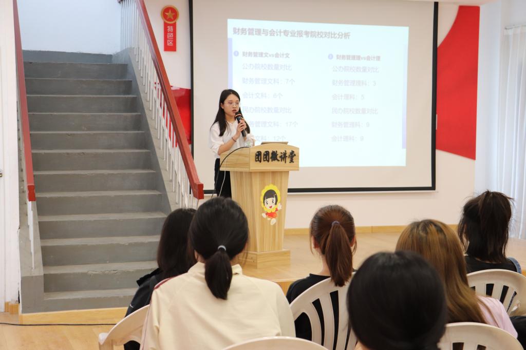 5月21日下午,用友·新道会计学院团总支在“向日葵”育人实践基地(青年之家)举行了第二十一期大学生“微讲堂”活动。本次“微讲堂”的主讲人是我院原17级会计专业学生李敏,主讲题目为《塑造自我,成就未来——专升本备考及志愿填报心得分享》,用友·新道会计学院团总支书记张璐、辅导员孟琰峰、李飞及近百名学子参加了此次活动,千余名学生通过我院官方抖音平台“SCY会计学院青春故事”直播观看了本场讲座。