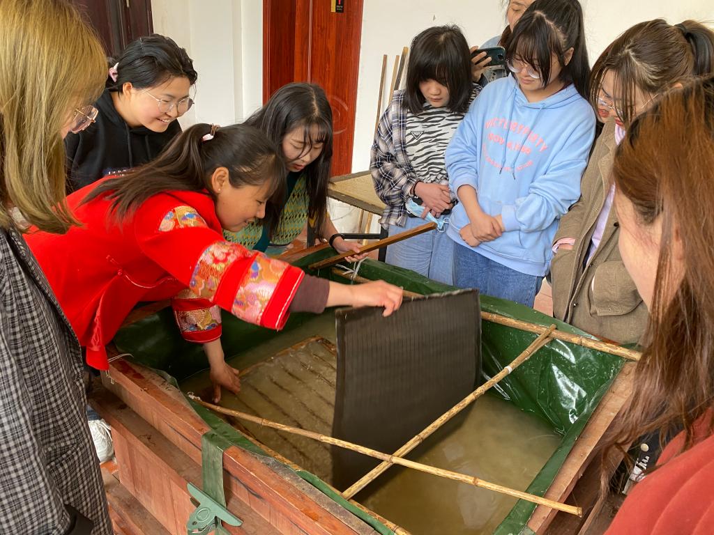 课后,学院院长程书强、人文艺术学院院长贺兴文,在刘晓东馆长与团队老师的带领下,与同学们一起学习、感受了踏碓、切番、打浆、抄纸等造纸工艺的步骤。大家积极参与其中,此次授课反响热烈。