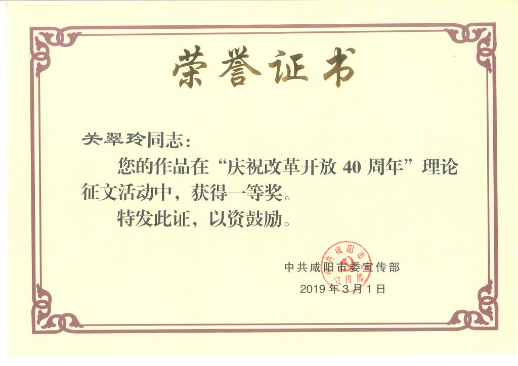 近日,由咸阳市委宣传部联合咸阳日报社举办的“庆祝改革开放40周年理论征文活动”比赛结果已公布,我院思政课教师关翠玲的作品《论马克思主义中国化的内生力》荣获大赛一等奖。本次征文活动旨在庆祝改革开放40周年,征文要求从不同角度、不同领域、不同方式反映改革开放40年来我国在全面建设社会主义现代化国家新征程中取得的巨大成就。我院广泛宣传,积极动员,认真组织教师参与,关翠玲的获奖作品充分展示了学院思想政治理论研究成果,取得良好成效。